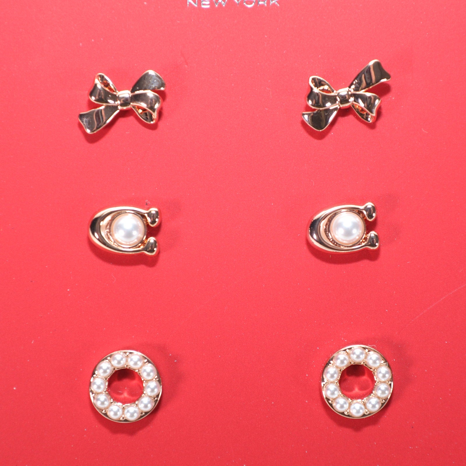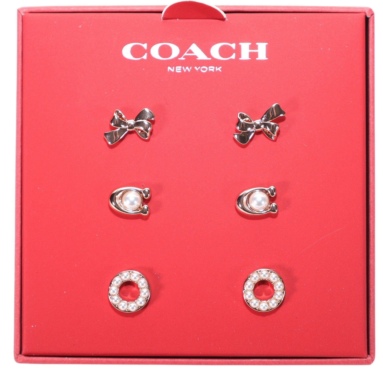The C-Stone Bow Rose Gold Stud Earring Set from Coach has a set of 3 versatile earrings to match any style.
