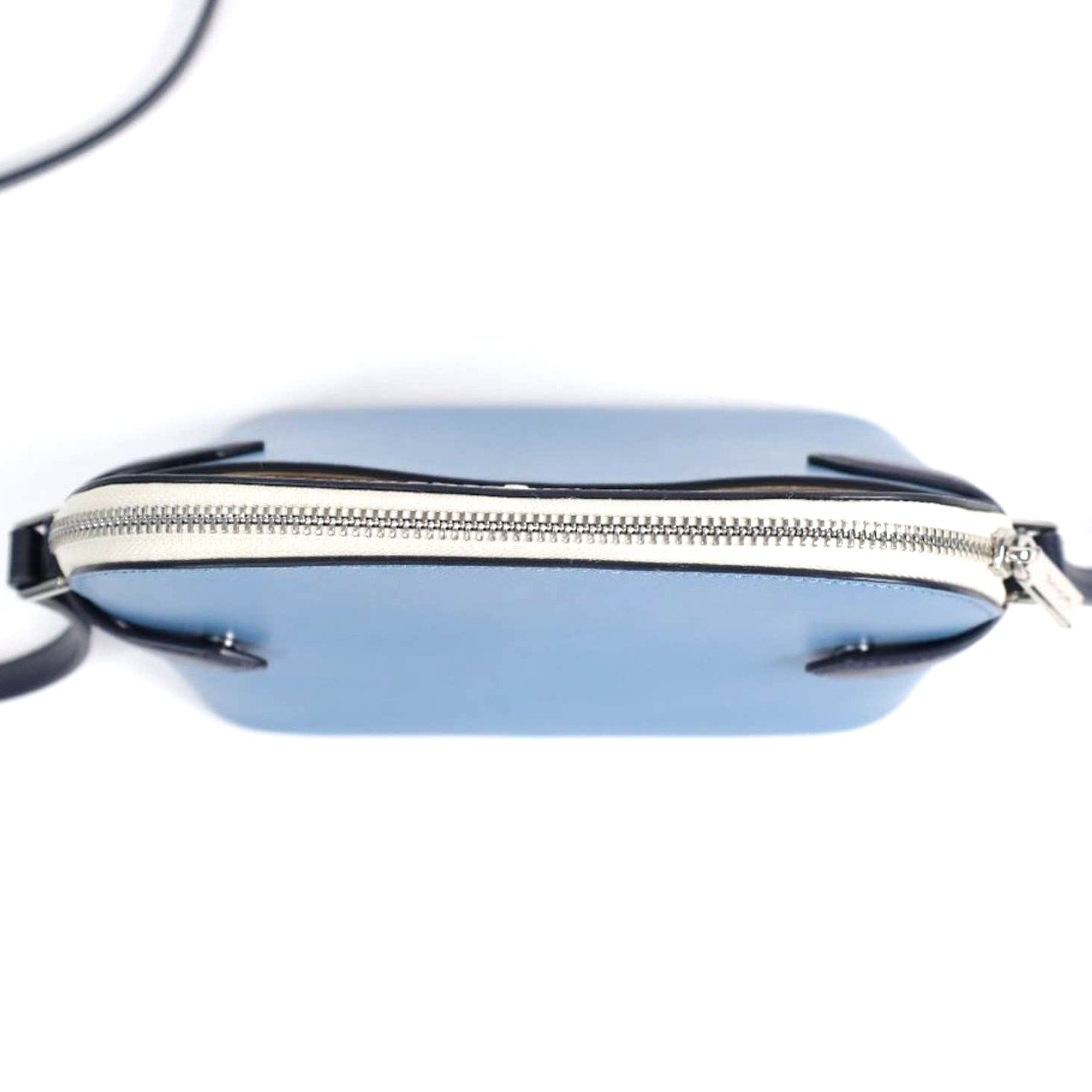 Strap: Adjustable navy crossbody strap with silver hardware, 22" drop adjustable by 6"