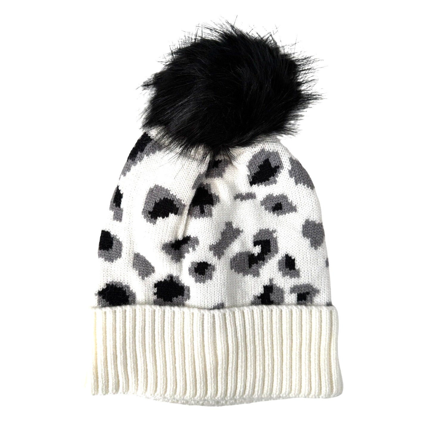 Virginia Wolf Leopard Beanie with Faux Fur Snap Pom Pom - White / Black